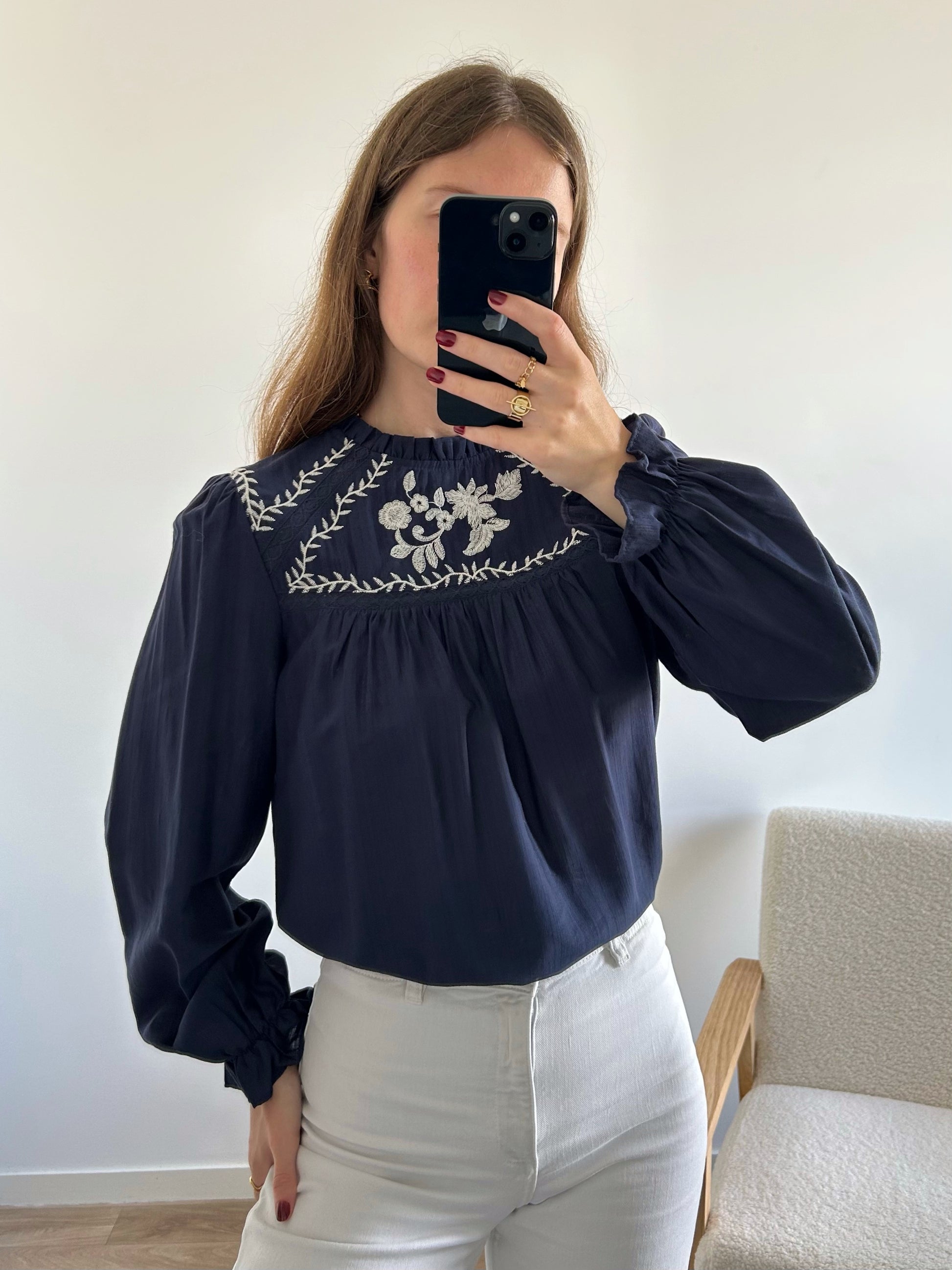 - Blouse bleu marine à détails brodés blancs