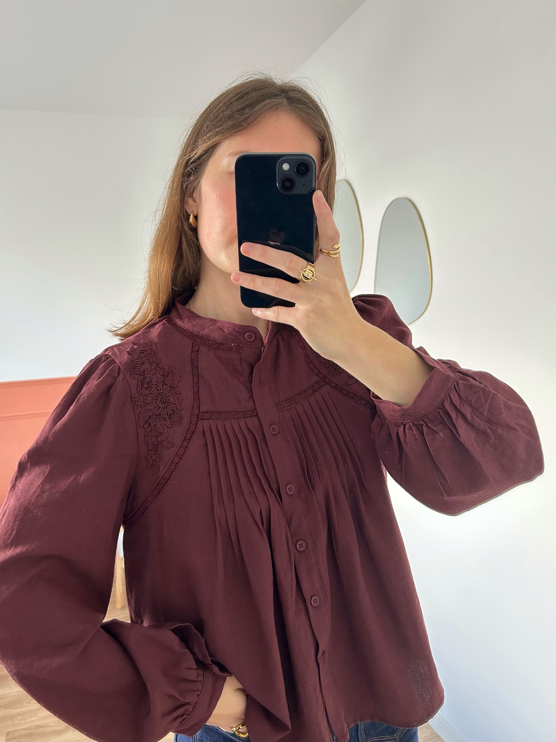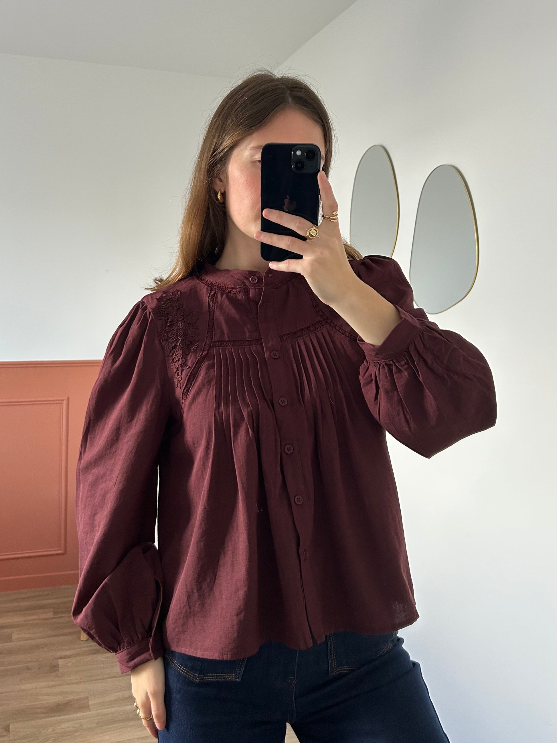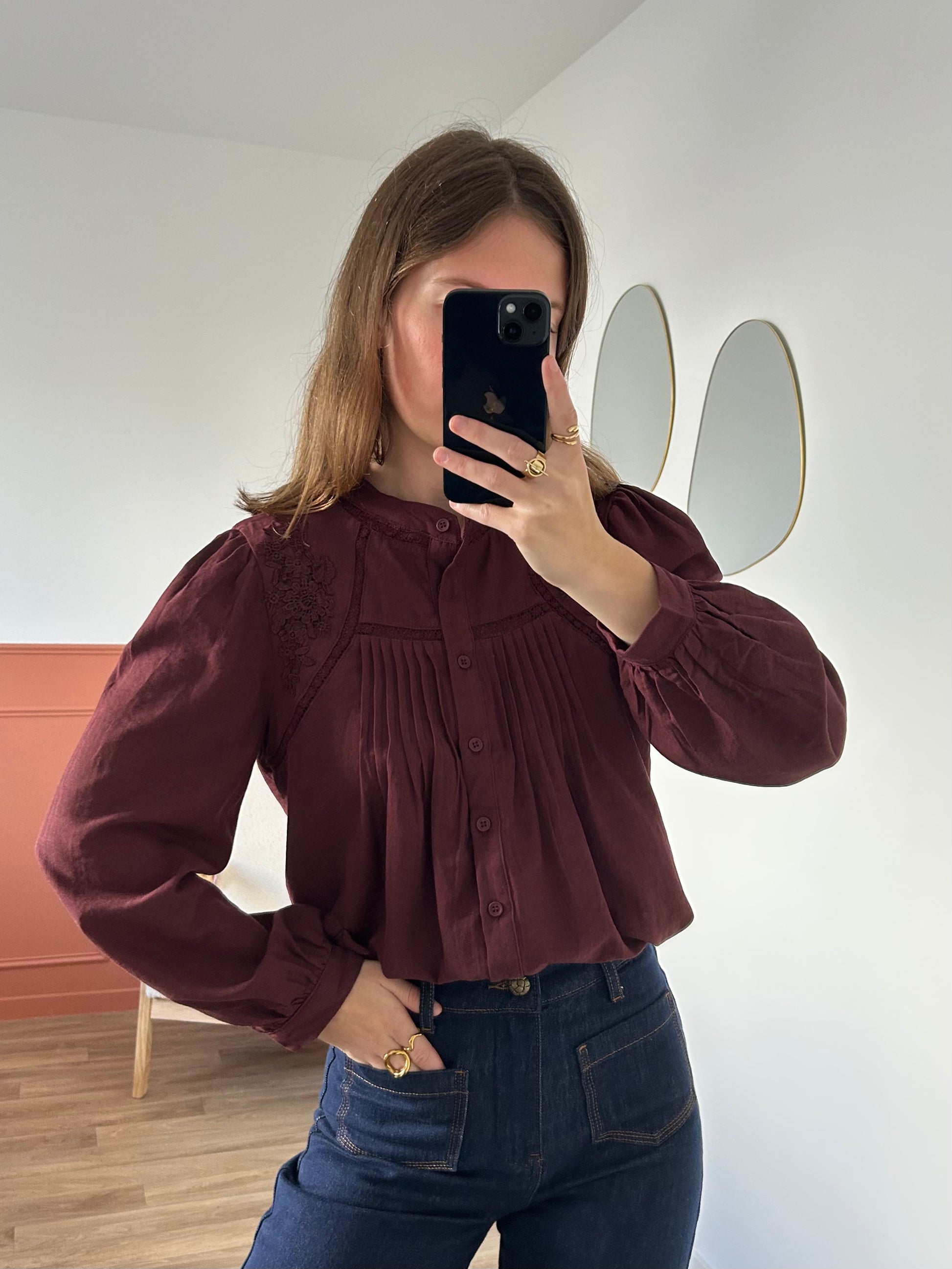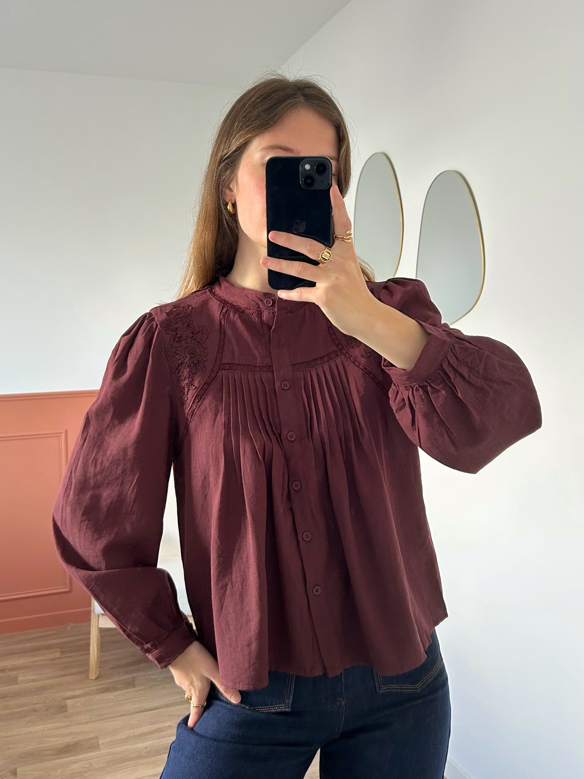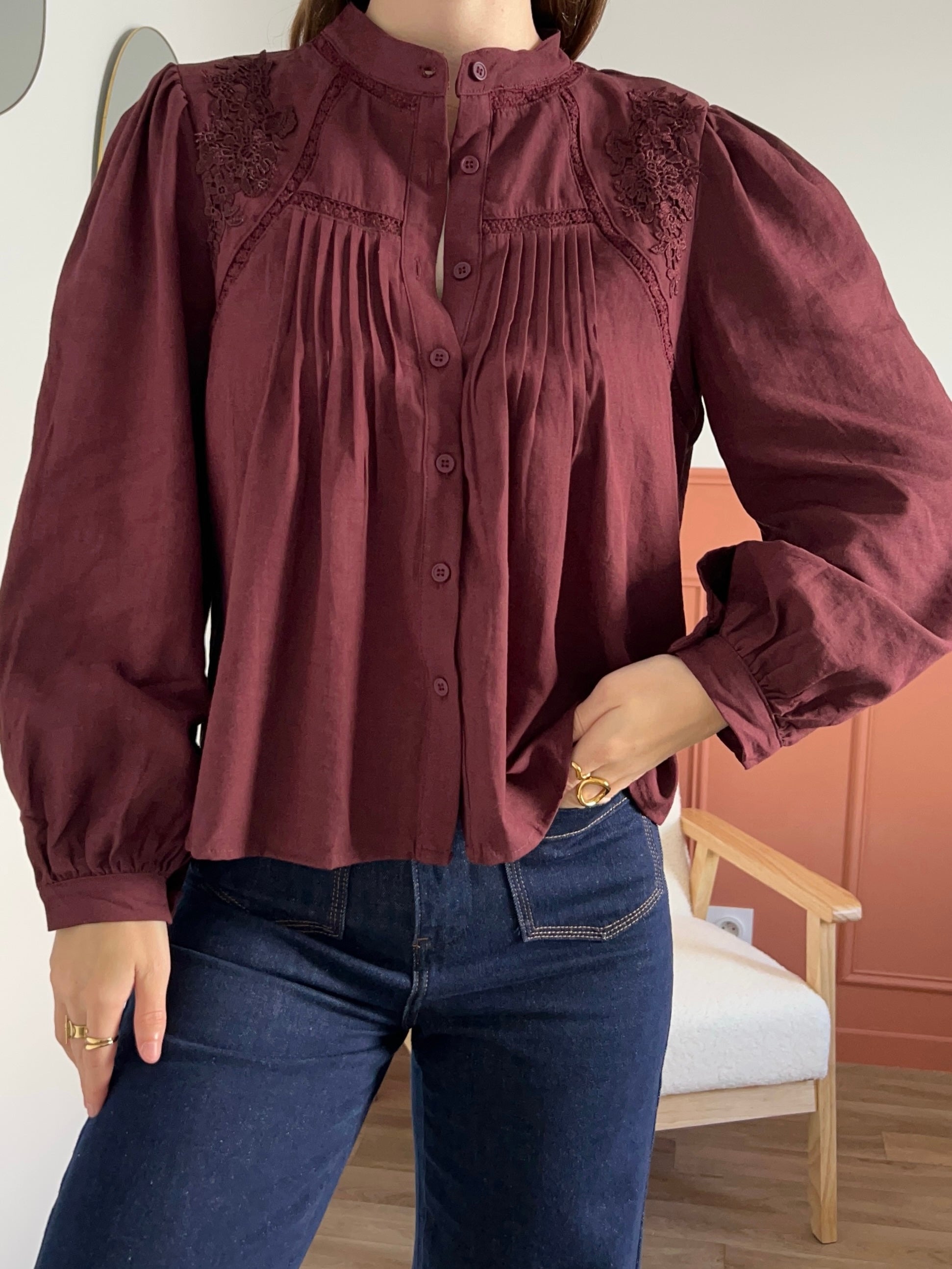 - Chemisier boutonné à détails de fronces et dentelle sur l'avant